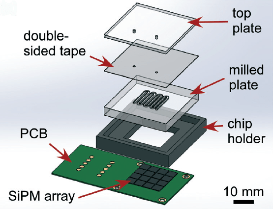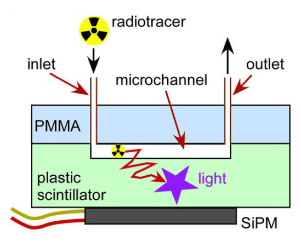 Scintillator-based radiation detection. We have designed a chip with a bottom layer consisting of a plastic scintillator seated on a SiPM. This has been tested with 18F samples to simulate 18F-FDG detection as part of a radioHPLC system. Such a procedure allows real time detection of radiotracers in clinically relevant concentrations while needing less space than conventional radio-HPLC detectors. [MD Tarn et al., Chem. Eur. J., 2018, 24, 13749.]