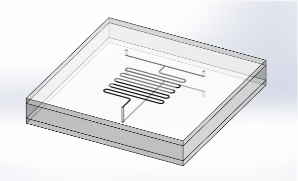 Microfluidic radiation detection. The interactions between silicon photomultipliers (SiPMs) and positrons allows radiation levels to be measured. The winding passage allows the full area of the SiPM to be fully exposed to radioactivity from a known volume of radiotracer. This method has been used to determine radiochemical identitiy by measuring half life and comparing it to known values as well as measuring activity levels. [MP Taggart et al., Lab Chip, 2016, 16, 1605.]