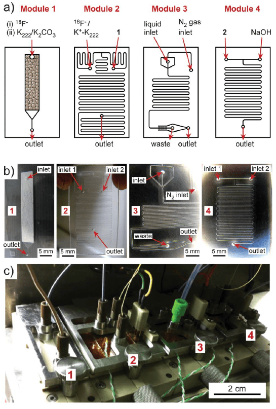 Combined 18F-FGD synthesis system. We collaborated with other professionals across Europe to produce a multi-chip system for 18F-FDG synthesis. This consisted of four modules for isolation, radiolabelling, solvent exchange and base hydrolysis (Modules 1 through 4 respectively). Modules 2 and 4 operated under elevated temperature. Enough 18F-FDG was collected after 19 minutes of operation for one dose. Publication: V. Arima et. al., Lab Chip, 2013, 13, 2328