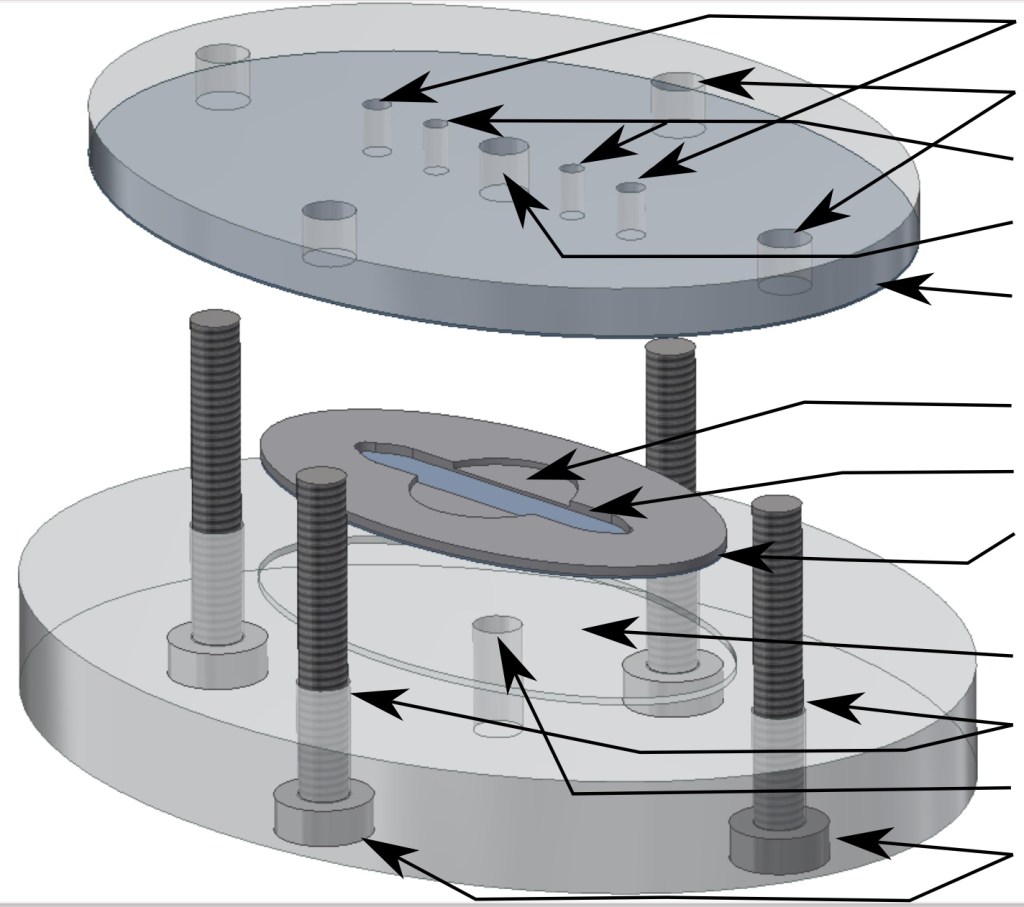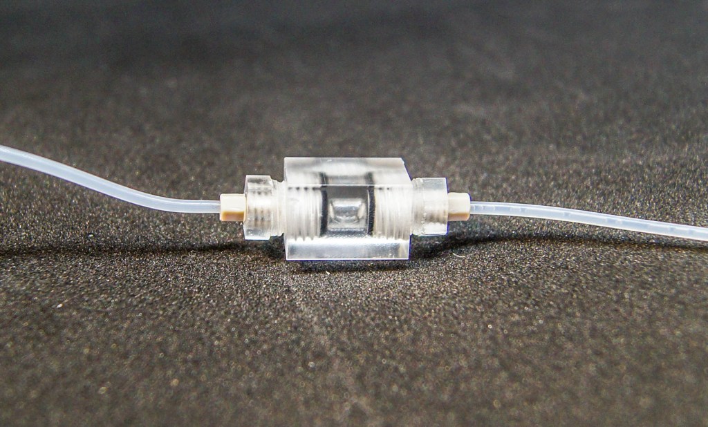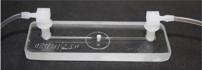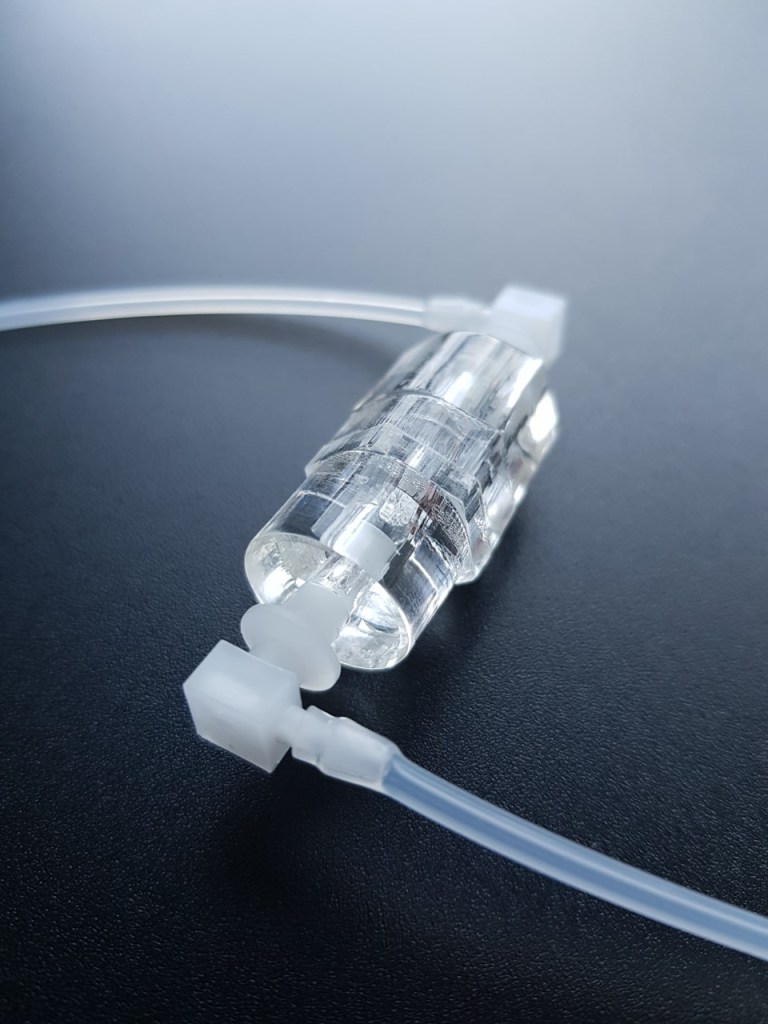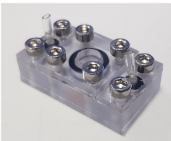 Example of a flow through device housing and maintaining tissue biopsies for perfusion. Such devices are employed in the groups of Dr Vicky Green and Prof. John Greenman at the Hull York Medical School. They are milled from polymer and interconnect to tubing through standard thread or push fittings.